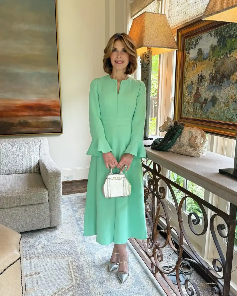 This soft green midi dress is a perfect example of how a well-cut dress can do all the work for you. The fitted waist and gentle flare create a flattering shape, while the clean neckline keeps it refined. The flowy sleeves add a subtle feminine touch without feeling too delicate.
