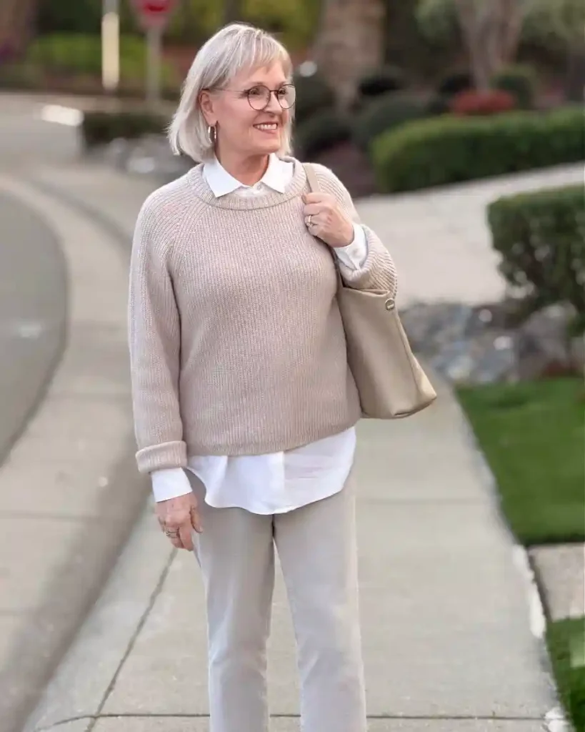 This is a simple outfit that looks thoughtfully styled. A soft beige sweater layered over a crisp white shirt adds dimension without effort. The slim pants keep the silhouette clean and easy to wear.