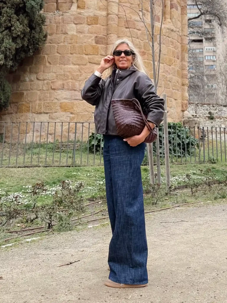 This look brings a bit of edge while staying completely wearable. A cropped leather jacket adds structure on top, while wide-leg jeans keep the outfit relaxed. The mix of textures makes the outfit feel more styled without needing bold colors.