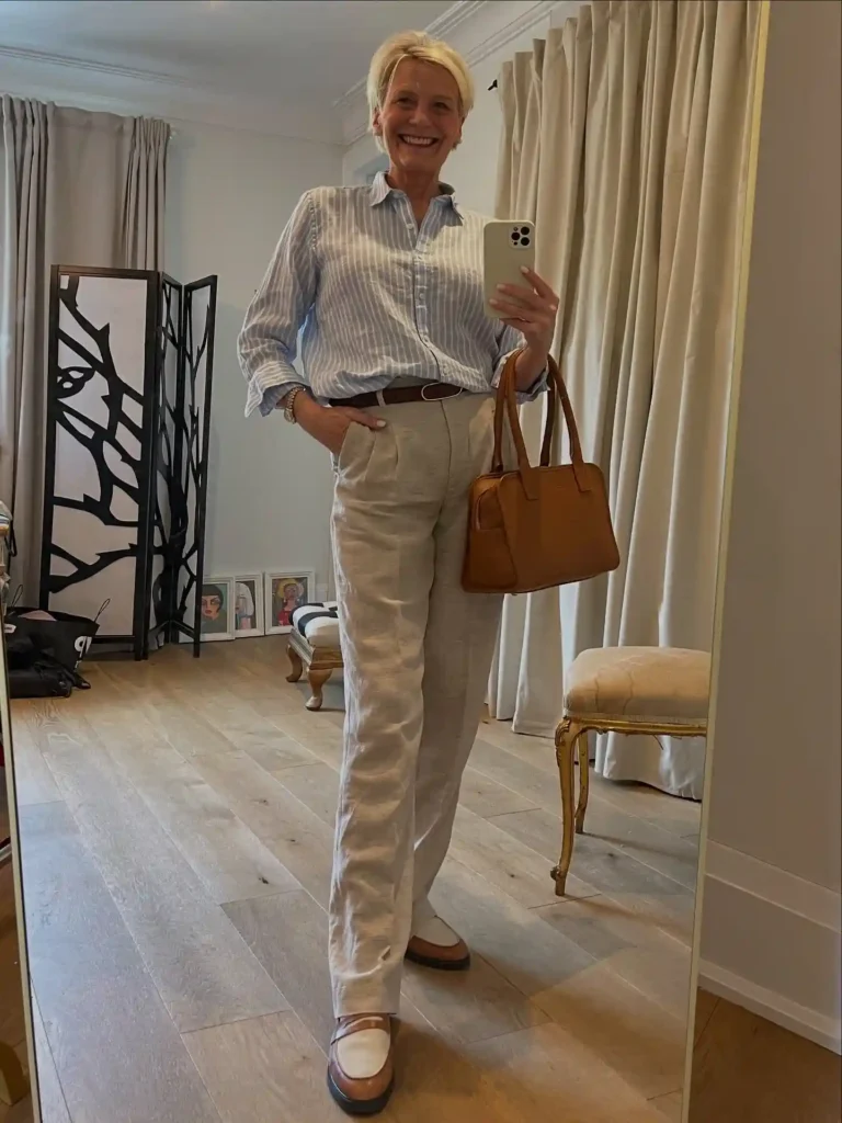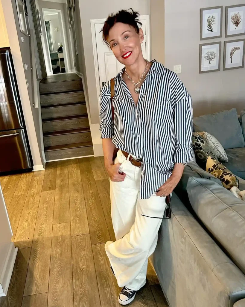This look is simple but very effective. A striped button-down shirt paired with wide-leg pants creates a relaxed yet polished outfit. The slightly loose fit makes it comfortable, while the tucked-in style keeps it neat.