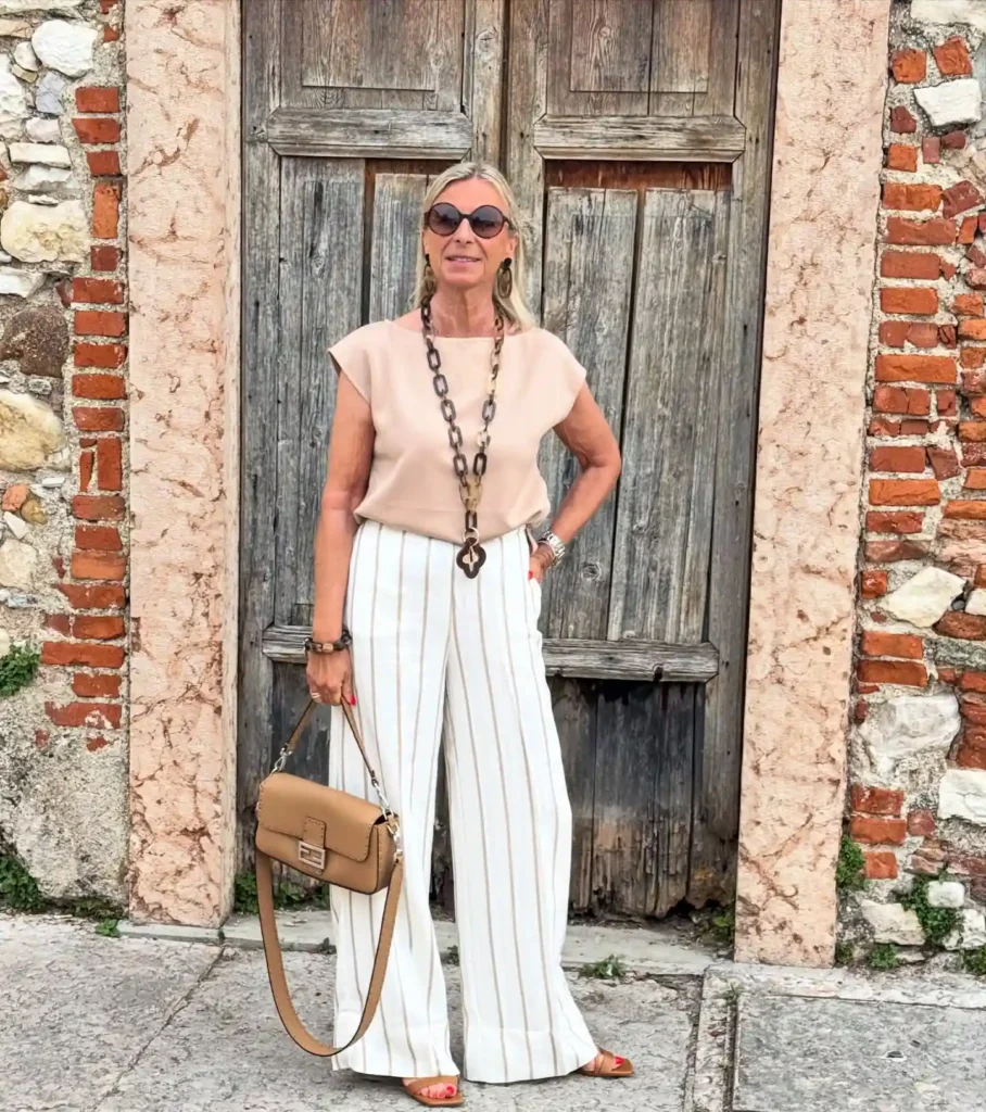 What stands out is the balance between fitted and relaxed pieces. The slightly cropped pants show off the ankles, which keeps the look light. Simple sandals and a structured handbag pull everything together without adding bulk.
