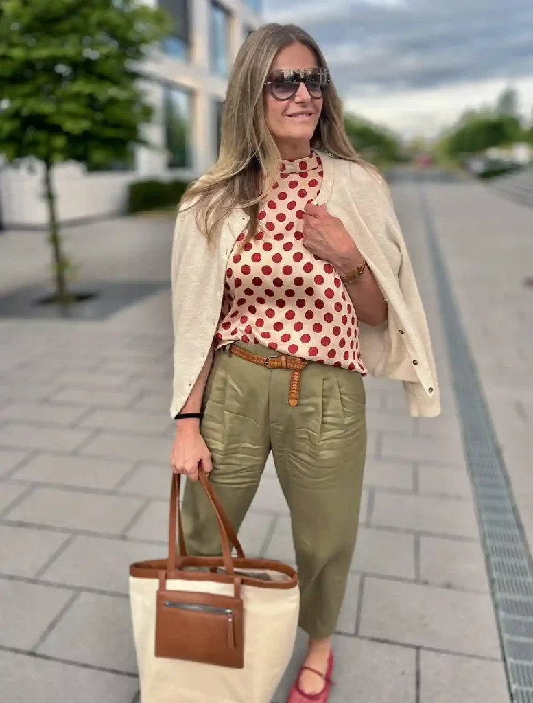This outfit mixes a playful print with earthy tones in a really balanced way. The polka dot blouse adds personality, while the olive pants keep everything grounded and easy to wear. A light cardigan draped over the shoulders gives it a relaxed but put-together feel.