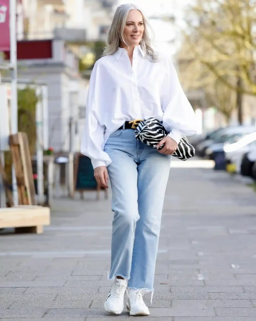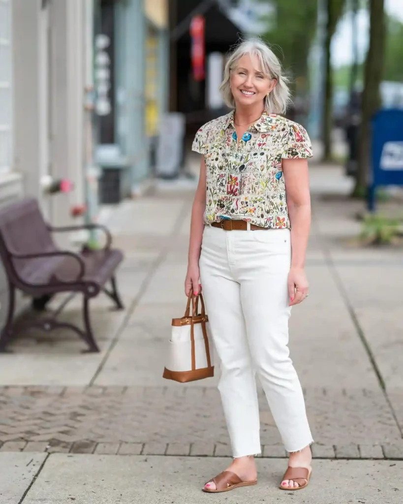 This outfit is a great reminder that prints can feel fresh at any age when styled right. A light, printed blouse paired with crisp white pants creates a clean and uplifting look. The soft colors brighten the overall outfit, making it perfect for daytime wear.