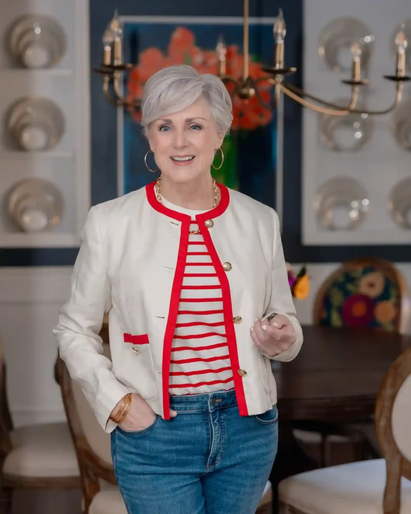 This is a strong choice for events, dinners, or even creative work settings. It shows that style after 50 doesn’t have to stay neutral—you just need clean tailoring to carry bold colors well.