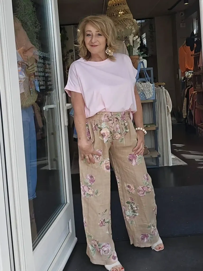 If you think comfort means boring, this outfit says otherwise. A simple pastel tee paired with floral wide-leg pants creates a relaxed yet put-together look. The soft fabric and loose fit make it easy to wear all day without sacrificing style.