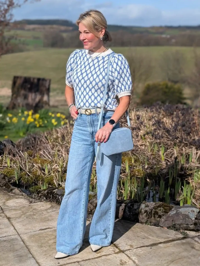 This outfit is all about easy comfort with a bit of shape. A soft knit top paired with wide-leg jeans creates a relaxed silhouette that still looks intentional. The fitted waist and tucked-in style prevent the outfit from looking oversized.