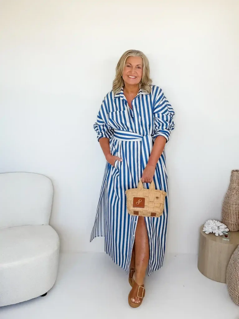 A striped shirt dress is one of the easiest outfits you can rely on. The vertical stripes naturally elongate the body, while the waist tie adds shape. It’s comfortable, breathable, and still looks styled.