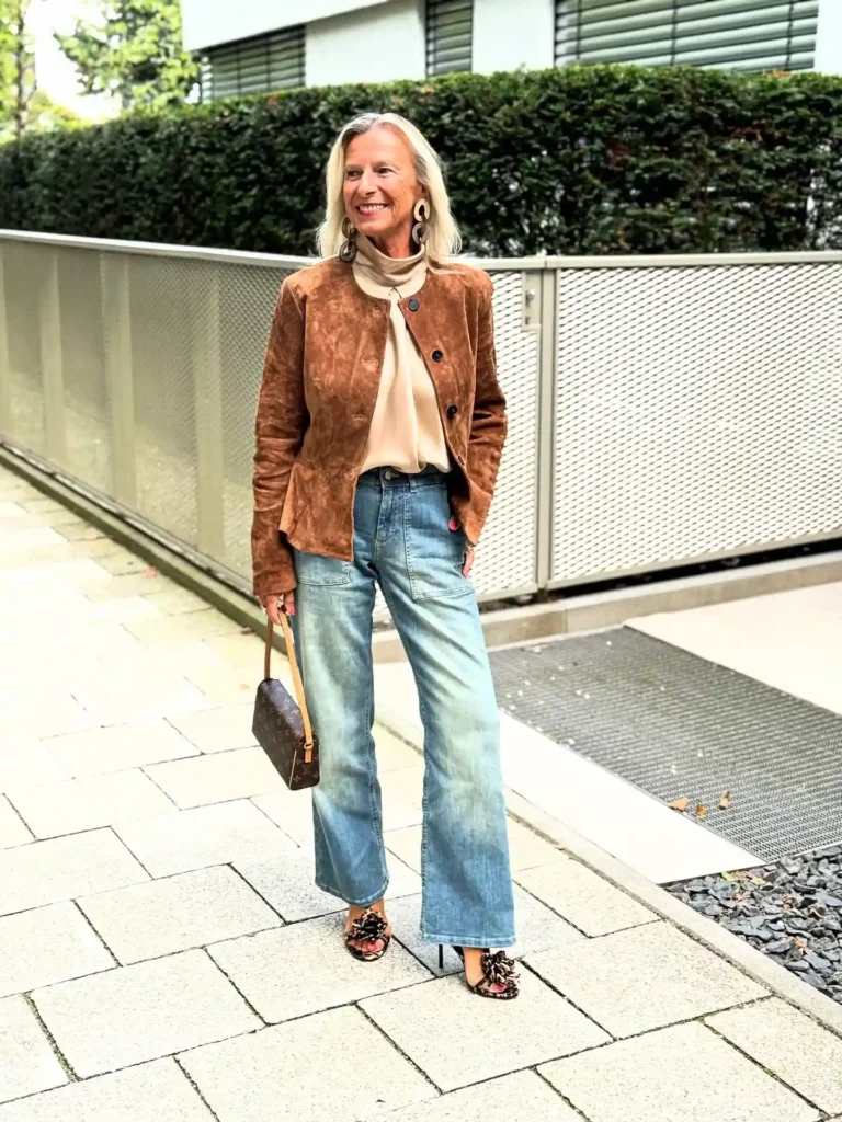This outfit combines texture with everyday basics. The suede jacket adds depth, while the straight-leg jeans keep the look simple and wearable. A soft neutral top keeps everything balanced.