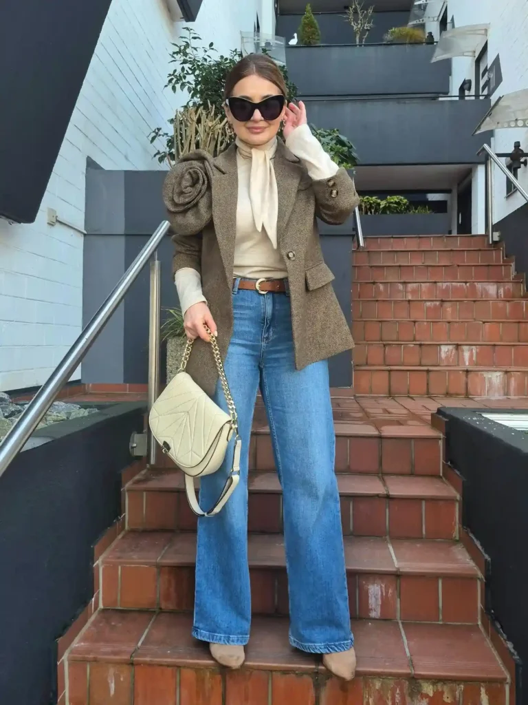 This outfit combines structure with comfort in a smart way. The fitted blazer shapes the upper body, while the wide-leg jeans add ease and movement. Neutral tones keep everything cohesive.