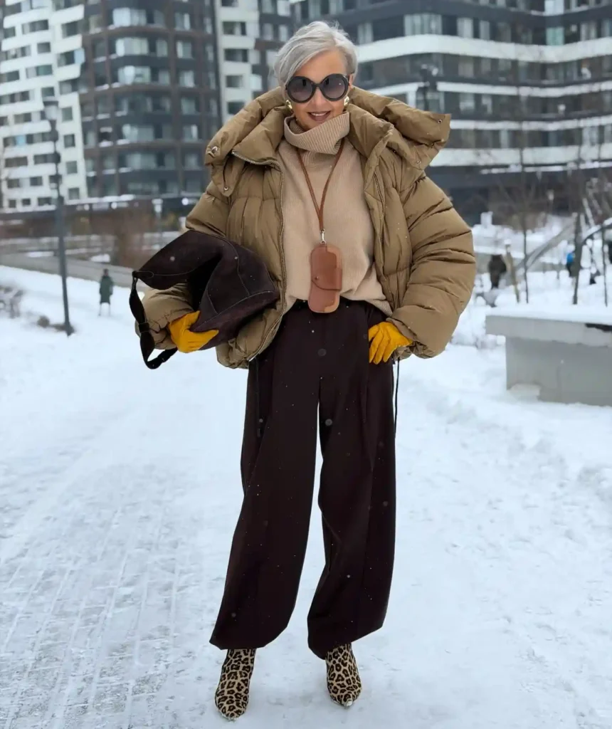 This outfit proves winter dressing doesn’t have to feel heavy or dull. A puffer jacket layered over a knit and wide-leg trousers keeps you warm while still looking stylish. The leopard boots add a fun contrast without overpowering the look.