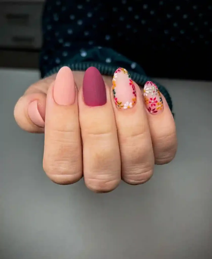 This almond-shaped manicure blends soft blush pink with a bold burgundy matte nail for a chic mix. The standout detail comes from the floral accent nails, framed with tiny blossoms in yellow, red, and white. It feels both playful and elegant, making it a great spring nail look for everyday wear or seasonal gatherings. Perfect if you want nails that capture spring’s fresh, colorful vibe without being too over the top.