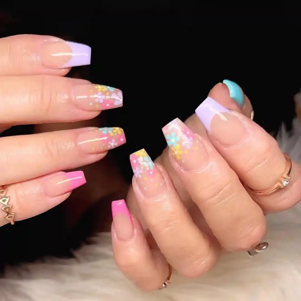 20.Colorful French Tips with Floral Confetti