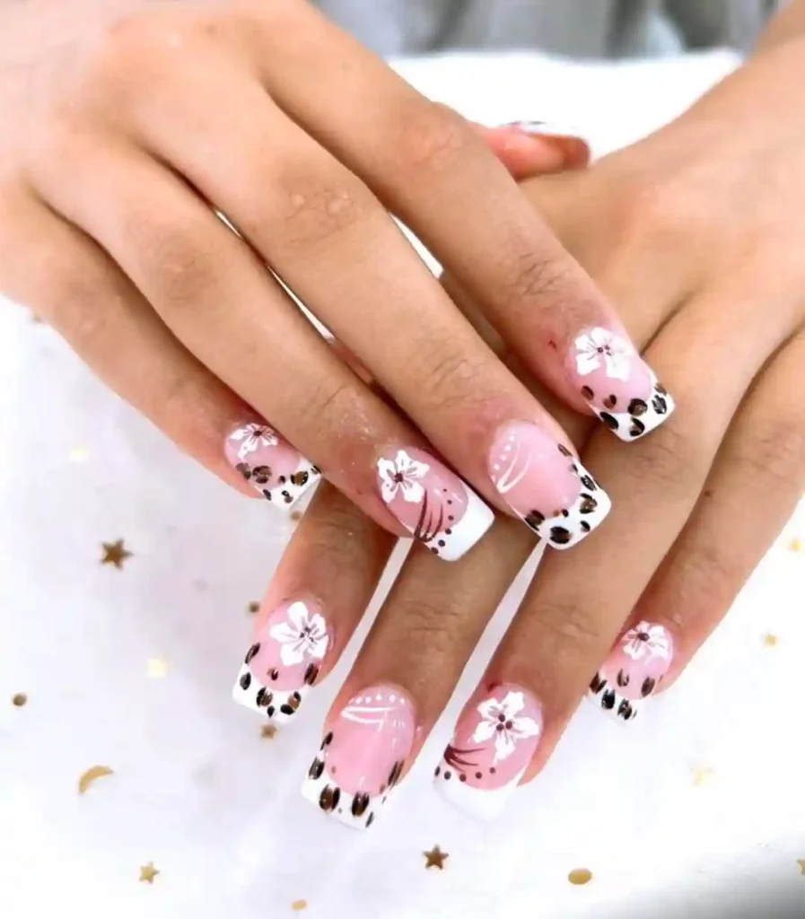 6.French Tip Florals with Animal Print Twist