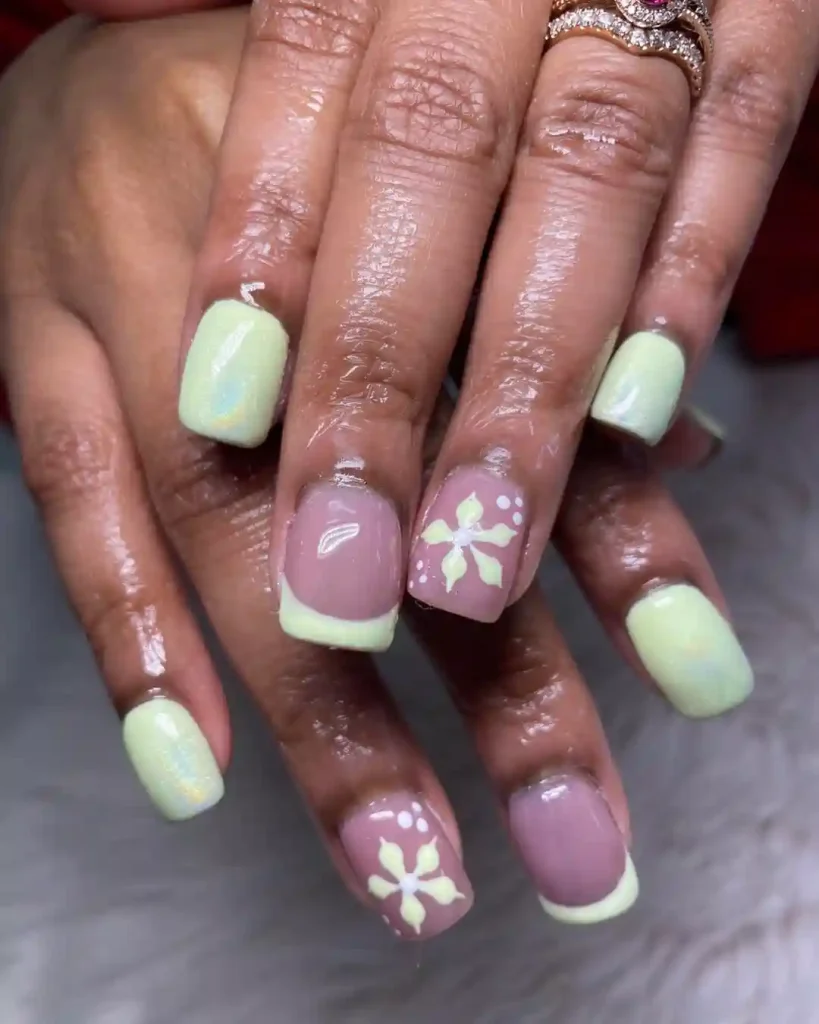 This set features a soft pastel mint green paired with nude square nails, highlighted by simple floral accents. The combination of mint French tips and daisy-like flowers creates a cheerful spring manicure that feels refreshing and modern. It’s a great option for anyone who wants a subtle design with just the right amount of seasonal charm. Perfect for spring brunches, casual weekends, or when you want your nails to look light and uplifting.