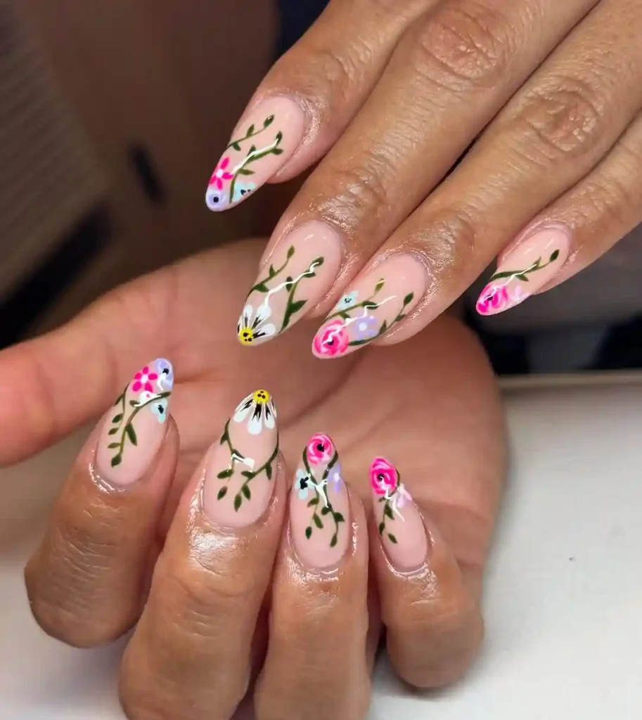 This design looks like a mini spring garden on your fingertips. Each almond-shaped nail features hand-painted flowers with green stems and leaves, creating a fresh and artistic vibe. The mix of daisies, roses, and colorful blooms against a nude base makes it feel whimsical and fun. Ideal for spring festivals or weekend outings, these nails are sure to get compliments. They’re perfect for anyone who loves detailed nail art with a natural touch.