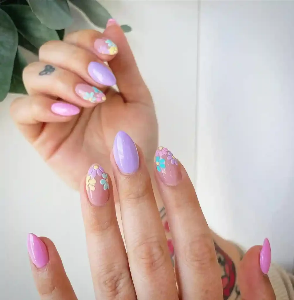This manicure combines solid pastel lilac and pink nails with accent nails decorated in tiny multi-colored flowers. The mix of simple shades and playful detailing makes it feel young and trendy. Great for spring outings, festivals, or casual days, these nails add charm without being overly complicated. If you love both minimalist polish and floral nail art, this design blends them perfectly.