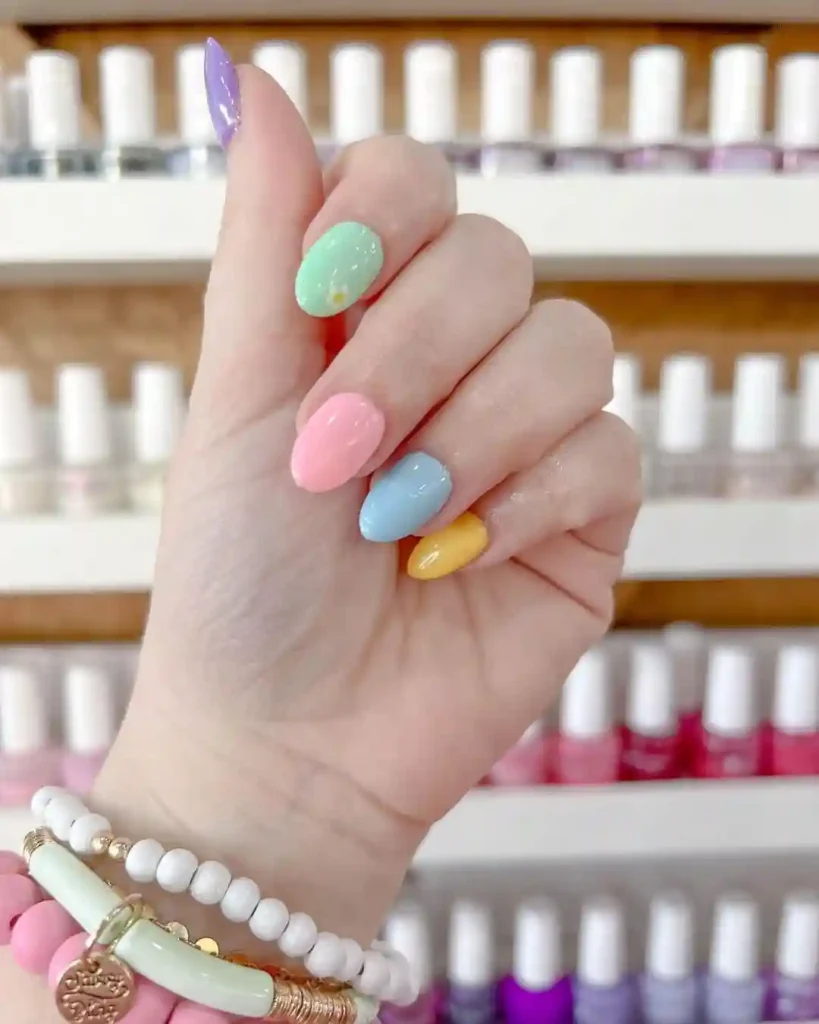 Nothing says spring nails quite like pastel shades. This manicure features a mix of soft purple, mint green, blush pink, sky blue, and sunshine yellow, each on a separate nail. The glossy finish makes the colors pop while still looking light and fresh. It’s a versatile spring manicure that works for everyday wear, Easter celebrations, or simply when you want your nails to match the season’s bright, happy mood.