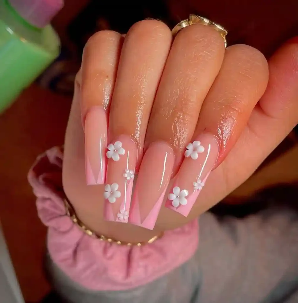 A chic twist on French tips, these long coffin nails use sharp pink V-shapes against a nude base for a geometric finish. What makes them pop are the 3D white flowers scattered across a few nails, adding softness to the clean lines. This spring nail design balances elegance with playfulness, making it perfect for parties or special events where you want your nails to stand out.