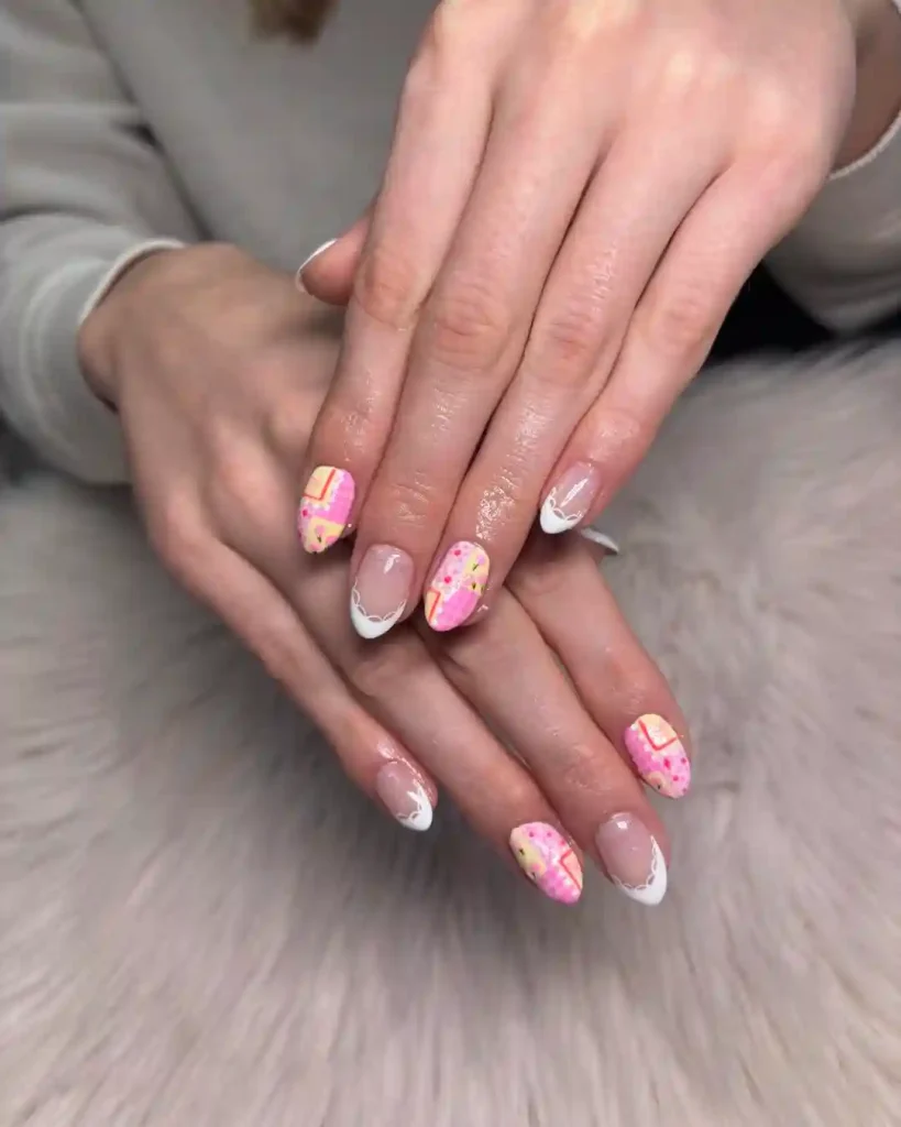 This set combines playful patterns in shades of pink, yellow, and white, creating a patchwork effect across each almond-shaped nail. Some nails keep it classic with dainty white French tips, while others feature geometric lines and dotted details. The look feels bright and creative—great for anyone who wants spring nails that stand out without being too loud. It’s a cheerful design perfect for casual spring outings or weekend brunch dates.