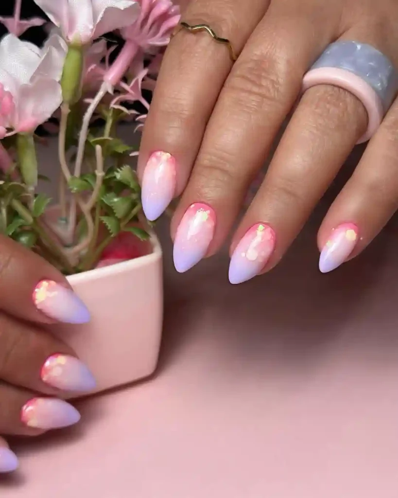 These almond-shaped nails blend soft pink and lavender tones into a dreamy ombré. Subtle glitter highlights near the cuticle give the design extra sparkle, making it feel light and magical. This look is perfect for springtime weddings, birthdays, or any event where you want a delicate yet eye-catching manicure. The gradient effect feels feminine and matches the blooming season beautifully.