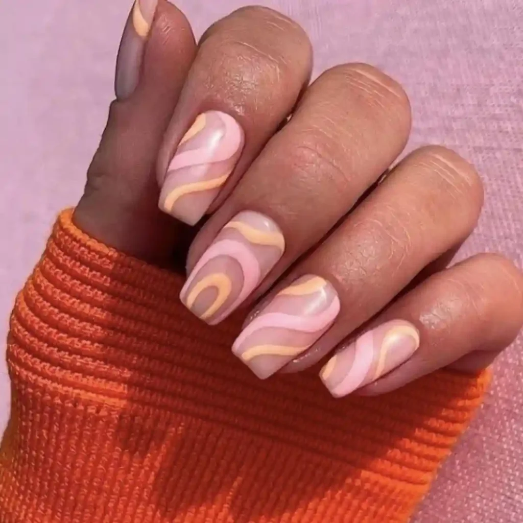 This set channels retro vibes with square-shaped nails painted in peach and pink swirls. The curved lines give a fun, ‘70s-inspired feel while still being fresh for spring. The soft color mix works beautifully against the nude base, making it a trendy yet wearable look. Great for casual spring outfits, music festivals, or just when you want your manicure to bring a playful pop of color.
