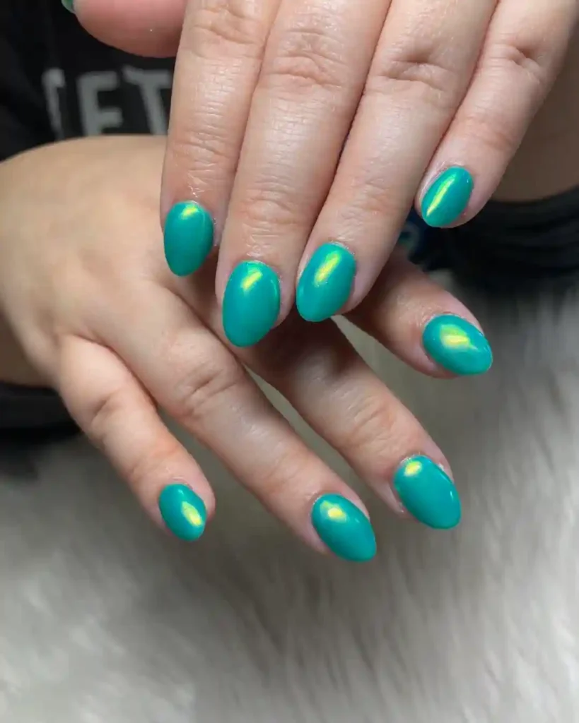 For a bolder spring nail idea, this design uses a striking teal base with a subtle golden shimmer in the center of each nail. The oval shape keeps it chic and wearable, while the glowing effect adds a fresh, eye-catching twist. These nails are perfect for spring nights out or vacations when you want something a little different from the usual pastel tones.