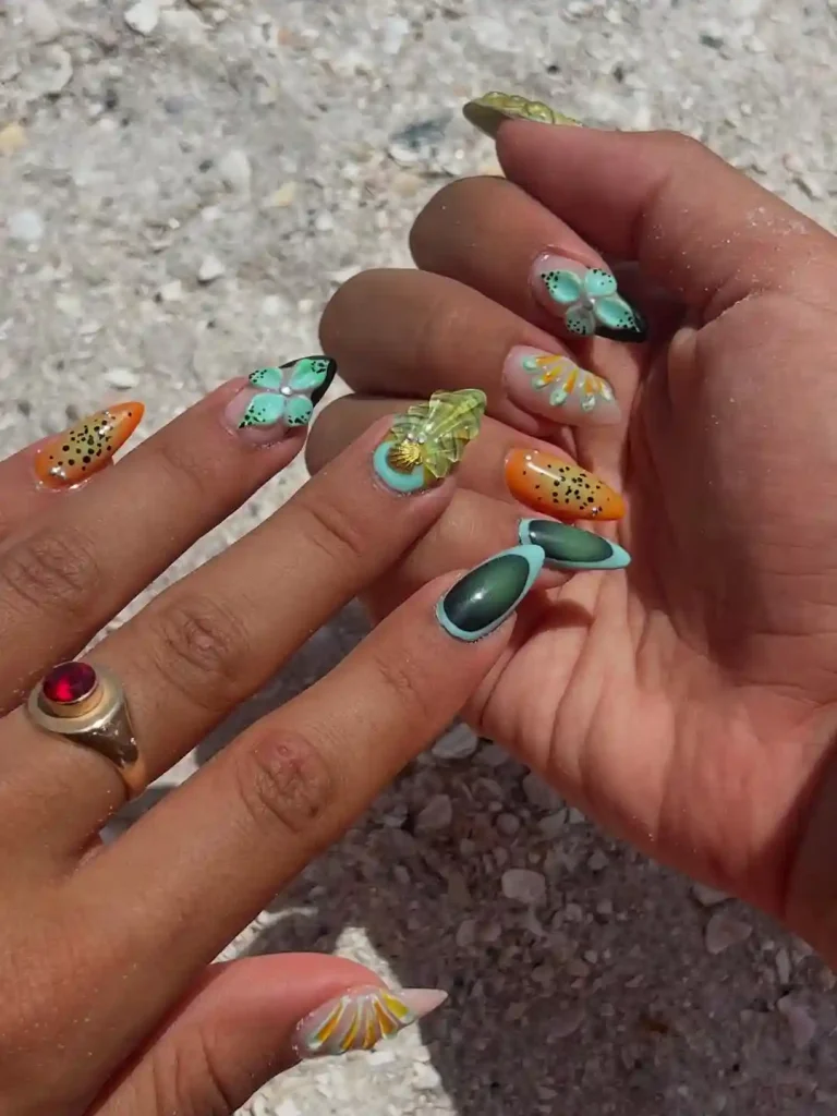 This playful spring nail set mixes bright orange, green, and yellow shades with 3D butterfly and fruit-like accents. The almond shape lets the details pop, from spotted patterns to shiny layered textures. It feels bold and adventurous—just right for beach days or outdoor spring parties. These nails are a great choice if you want a spring manicure that feels creative, fun, and full of life.