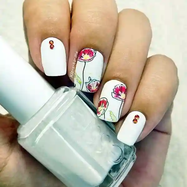 Classic white nails get a spring refresh with hand-drawn red and pink flowers on select nails. The crisp white background makes the floral art look like tiny sketches on a canvas. Small rhinestones add a bit of sparkle without overwhelming the design. This style is perfect for minimalists who still want a touch of seasonal flair. It’s clean, versatile, and ideal for spring weddings or everyday wear.
