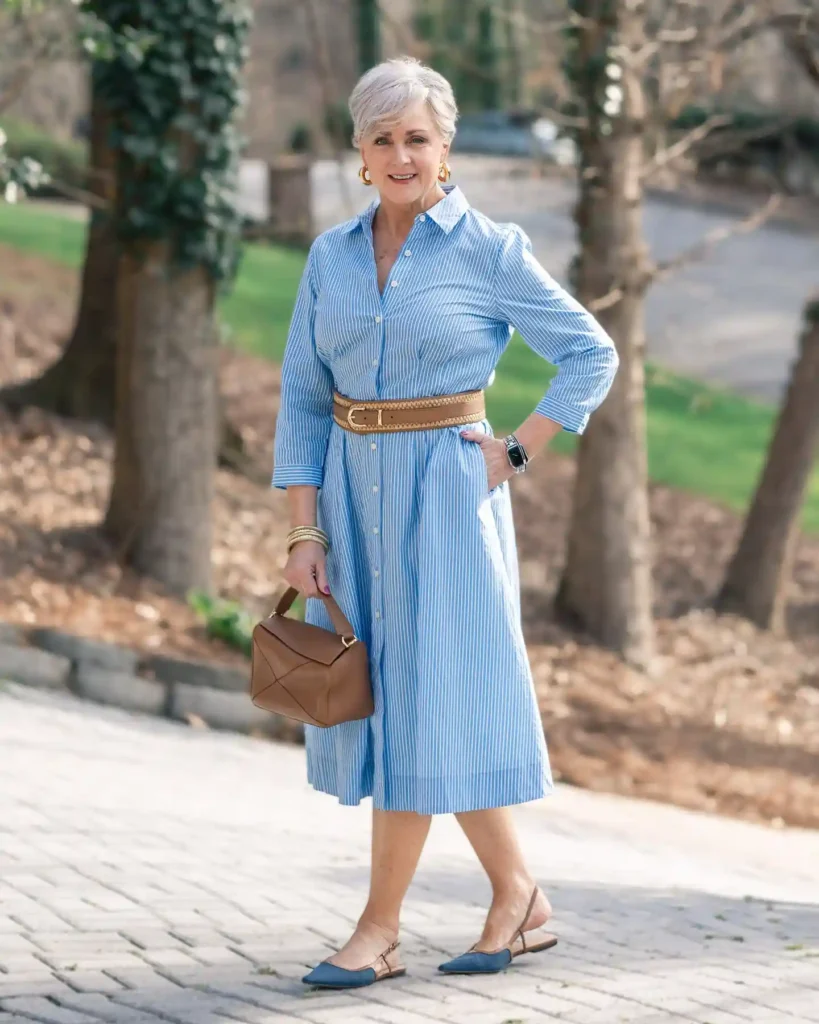 This outfit feels classic but still fresh for summer. The blue striped shirt dress gives structure, while the belt adds shape and keeps it from looking too loose.