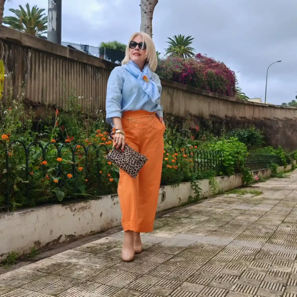This outfit plays with color in a confident but wearable way. The bright orange cropped pants stand out, while the soft blue shirt keeps the look balanced and calm.