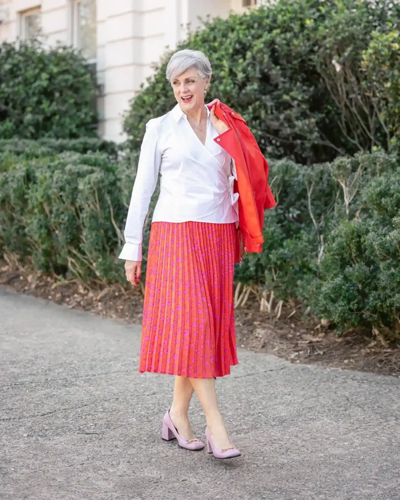 This outfit adds a fun pop of color while still feeling age-appropriate and polished. The bright pleated skirt brings movement and energy, while the light wrap-style blouse keeps the look balanced and flattering.