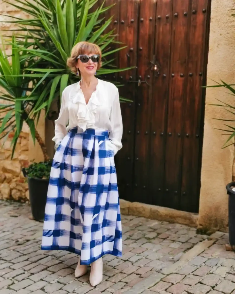 This outfit feels feminine and well-balanced. The soft blouse with subtle ruffle detail adds movement on top, while the blue checked midi skirt gives structure and shape.