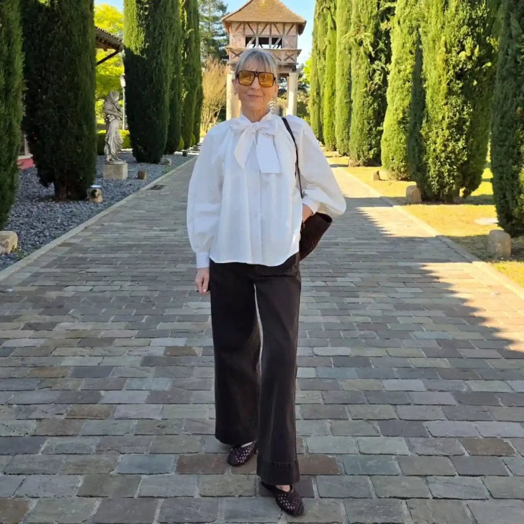 This outfit keeps things clean and polished without trying too hard. The white blouse with a soft bow detail adds a feminine touch, while the wide-leg black pants create a long, flattering line.