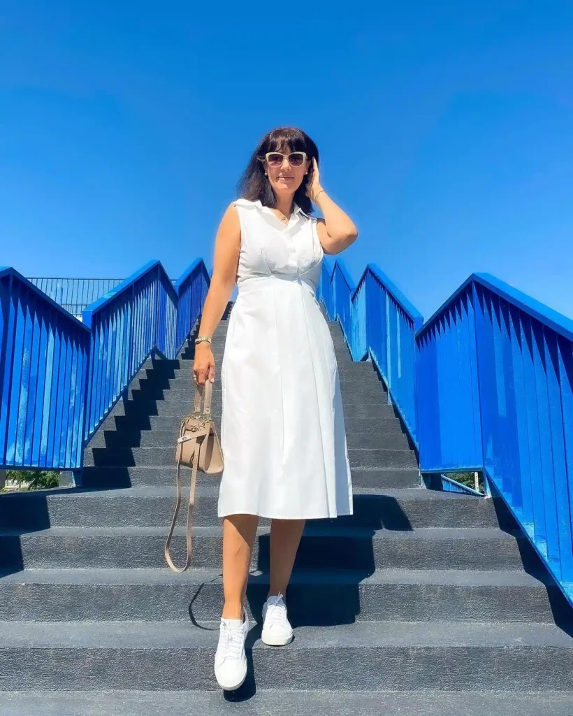This look mixes comfort with a clean, modern feel. The structured white dress gives shape, while the sneakers make it practical for walking and everyday wear.