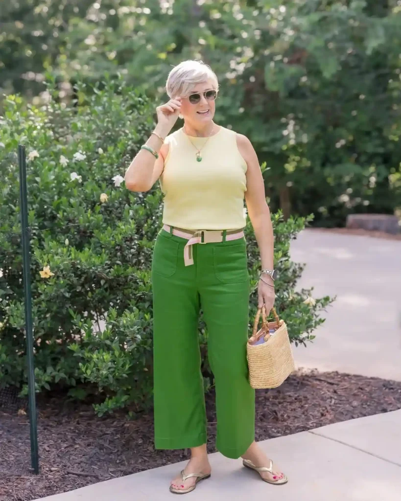 This outfit brings in color without feeling too bold. The green cropped pants add a fresh summer feel, while the sleeveless light top keeps it soft and balanced.