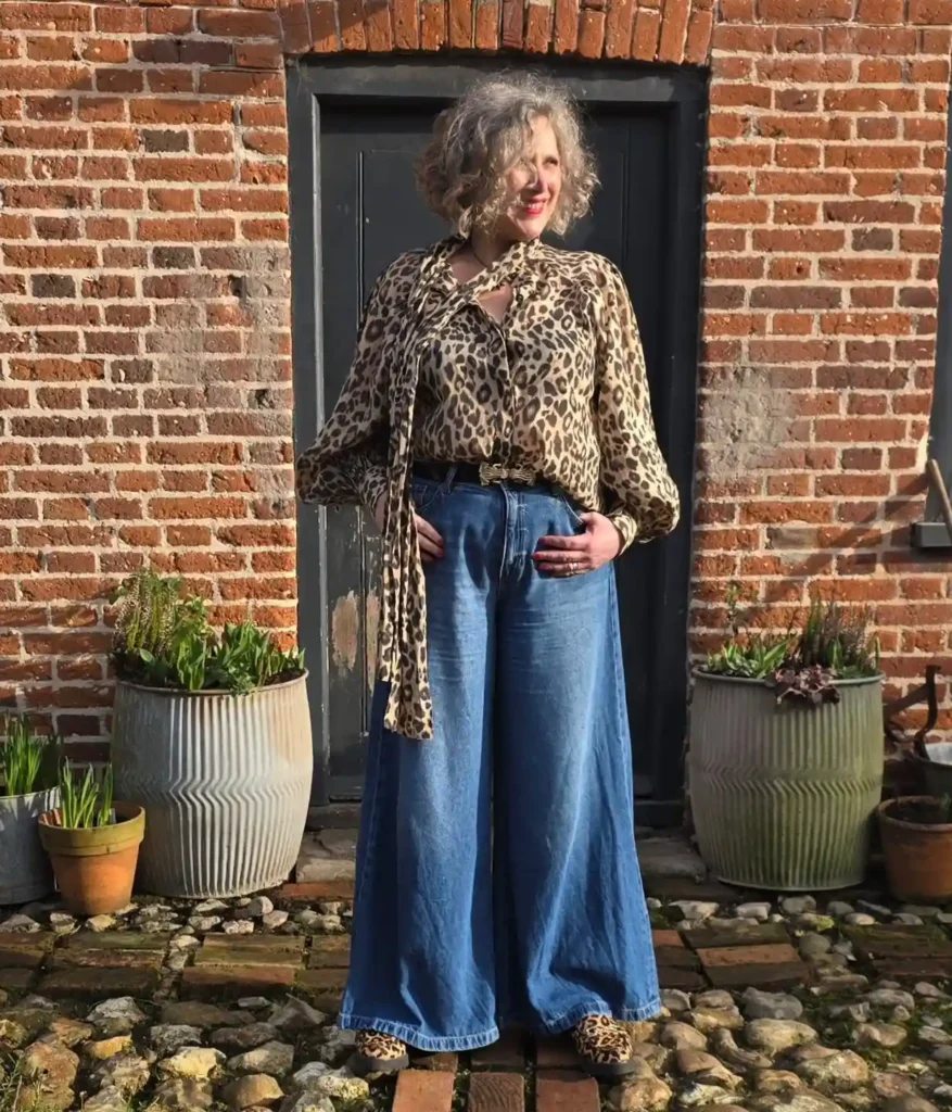 This outfit mixes bold and relaxed in a smart way. The leopard print blouse adds personality, while the wide-leg denim keeps the look grounded and easy to wear.