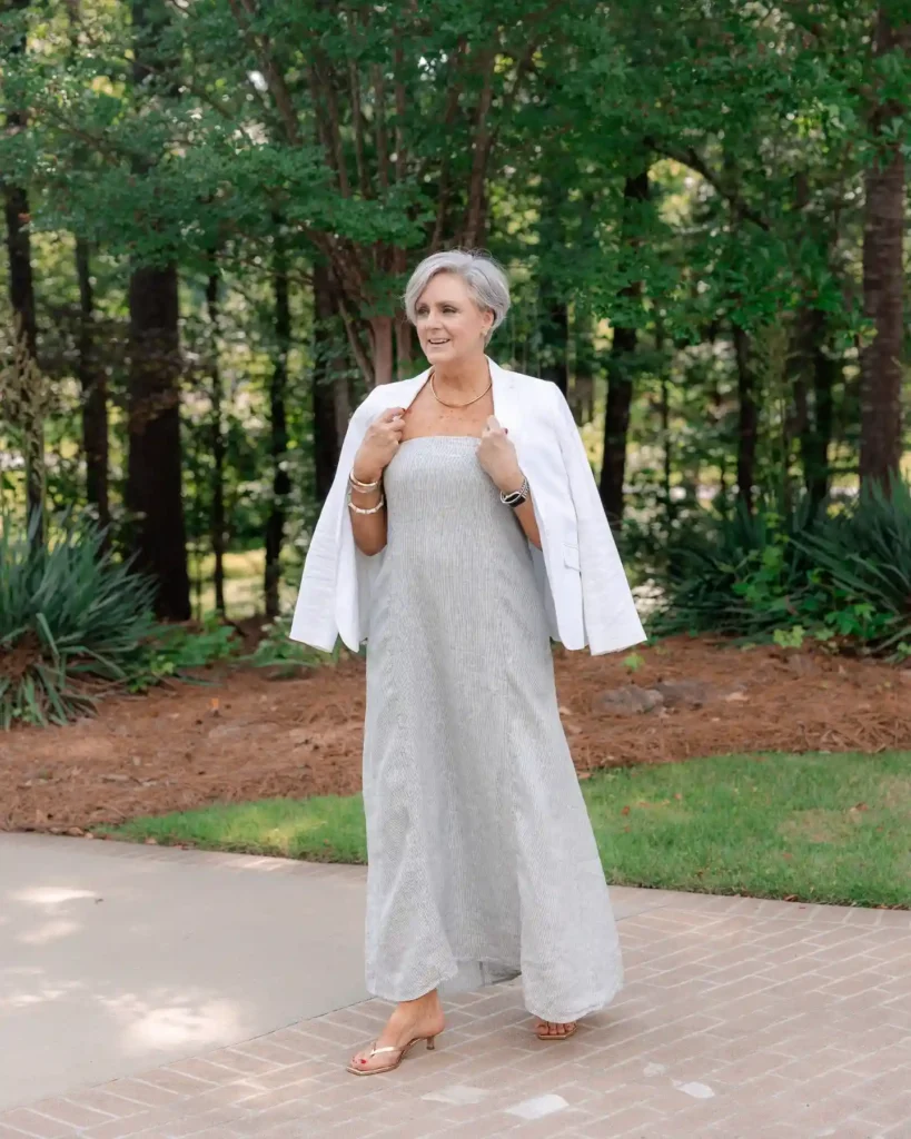 This look is clean and quietly elegant. The strapless neutral dress keeps things simple, while the lightweight blazer adds structure without feeling too formal.