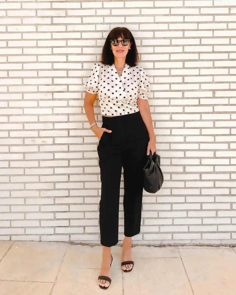 This outfit brings in a bit of personality while staying polished. The polka dot wrap-style top adds shape and interest, while the black cropped pants keep everything balanced.
