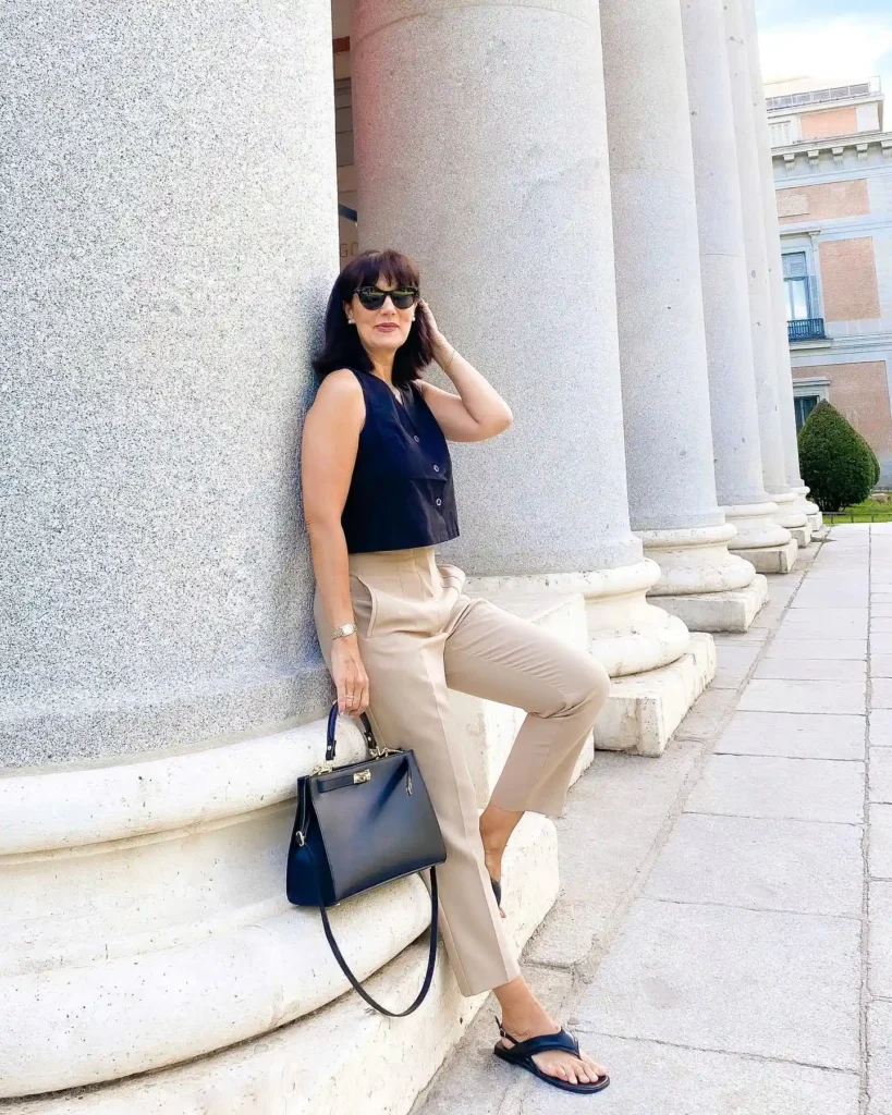 This look leans into clean lines and simple contrast. The sleeveless black top keeps things sleek, while the beige tailored pants soften the outfit and add a polished touch.