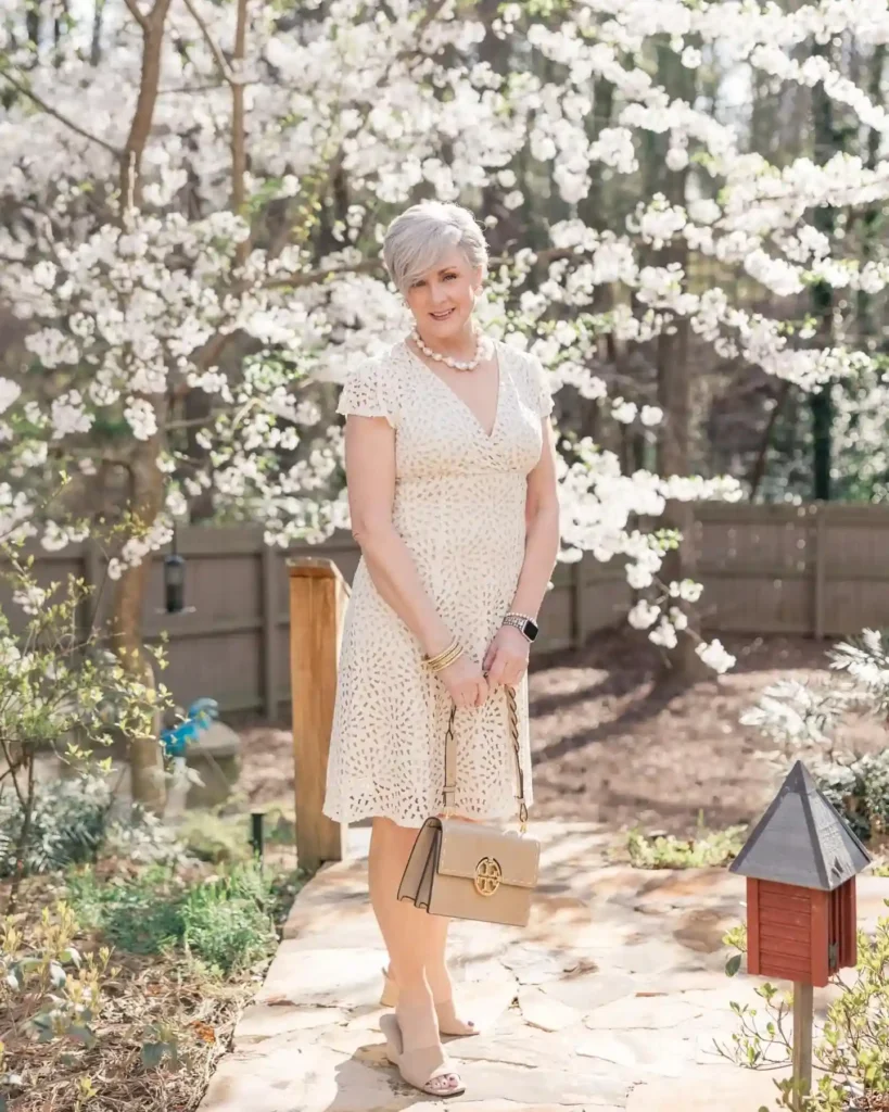 This outfit feels soft, feminine, and perfect for warm weather. The light neutral lace dress adds texture without being heavy, while the short sleeves keep it breathable and easy to wear.