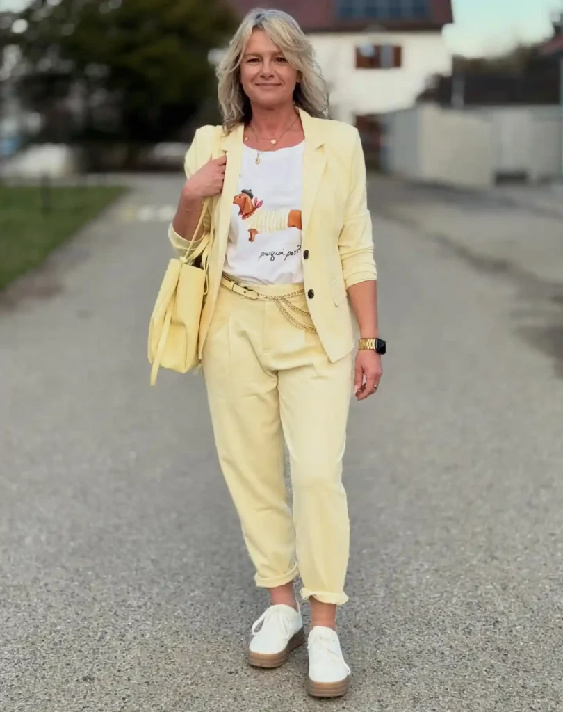 This outfit feels fresh and playful without trying too hard. The soft yellow suit brings color in a calm way, while the graphic tee keeps it relaxed and modern.