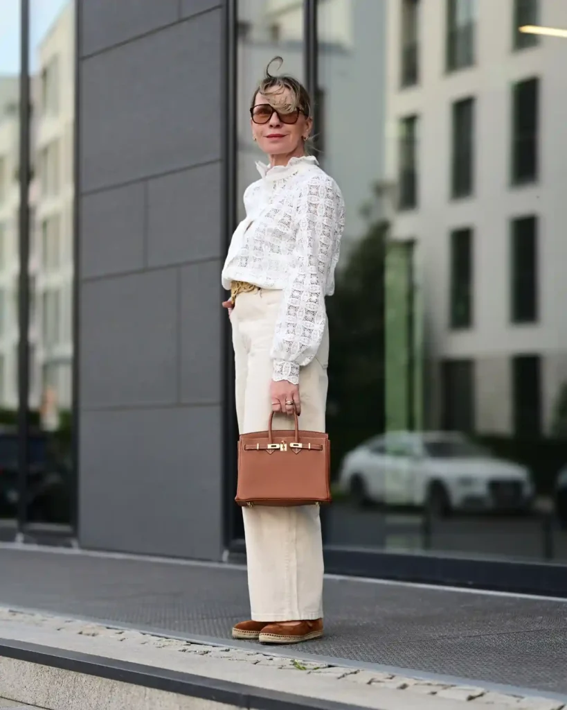 This outfit keeps things soft and refined. The textured white blouse adds detail without being too much, while the neutral pants create a calm and balanced look.