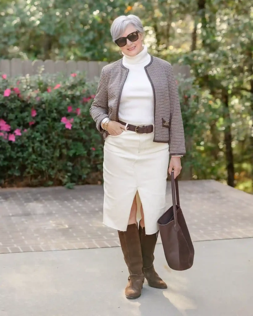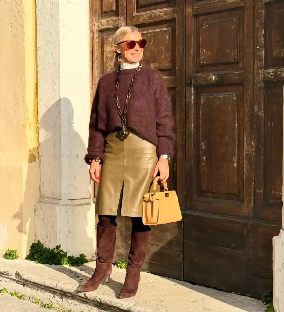 Pairing a cream turtleneck with a matching split-hem skirt creates a soft, feminine base that contrasts beautifully against the ruggedness of suede boots. It’s an ideal ensemble for a wine-tasting tour or a stroll through a historic village.