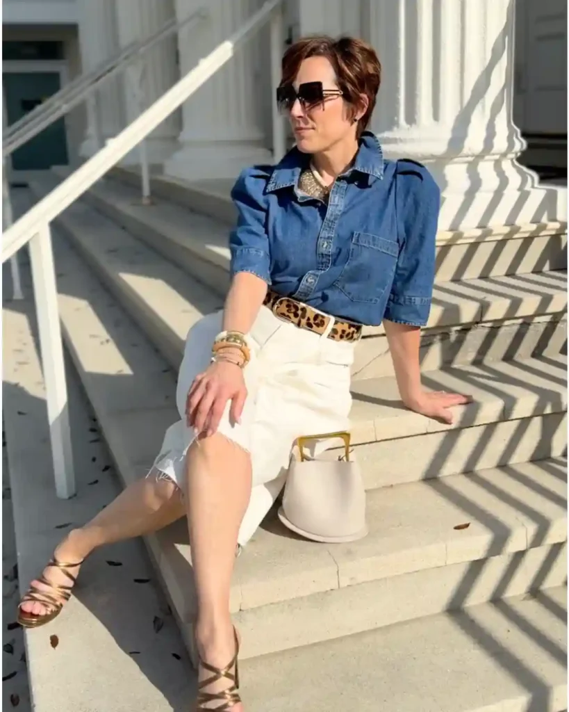 Tucking a darker denim top into crisp white denim skirts or trousers creates a sharp contrast that looks incredibly modern. This is a durable, “wash-and-wear” look that holds up beautifully through a long day of transit.