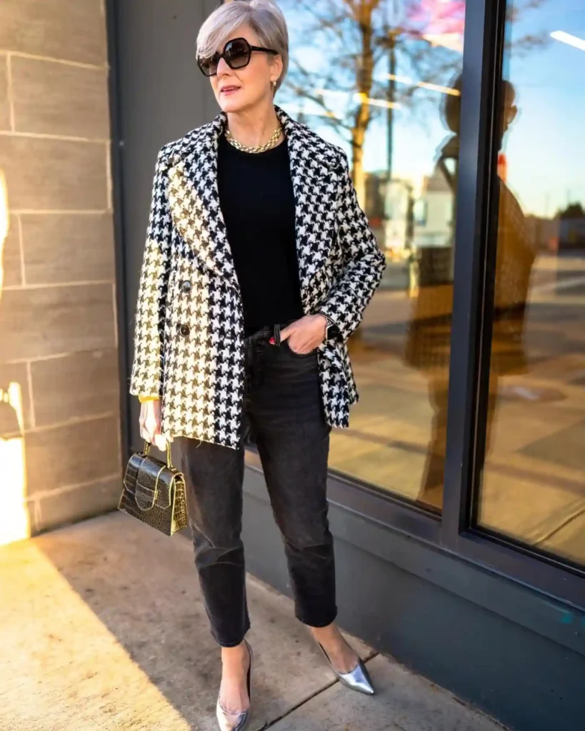This outfit plays with scale and shine to create a look that feels very “Milanese fashion editor.” The oversized houndstooth blazer is a bold graphic statement that pairs perfectly with basic black layers.
