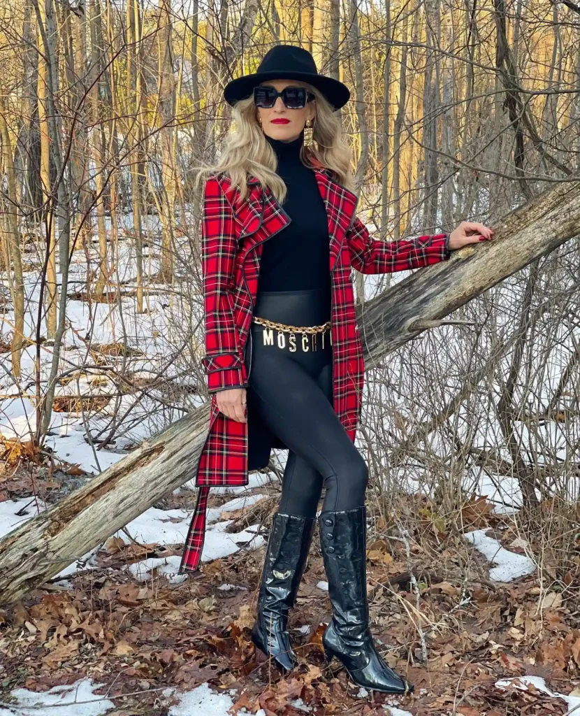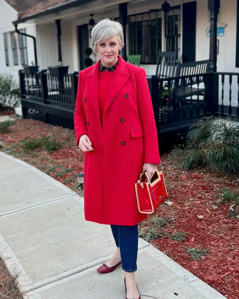 Make a bold entrance into any winter destination with a long, vibrant red plaid coat. This piece is a statement in itself, offering a “punk-meets-royal” aesthetic that is incredibly fashionable for the confident woman over 50.