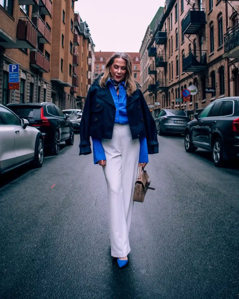 This look is the definition of “traveling with intent.” A bright cobalt blue shirt tucked into crisp white wide-leg trousers creates a high-contrast, professional aesthetic that is perfect for a city-based business trip or a luxury cruise.