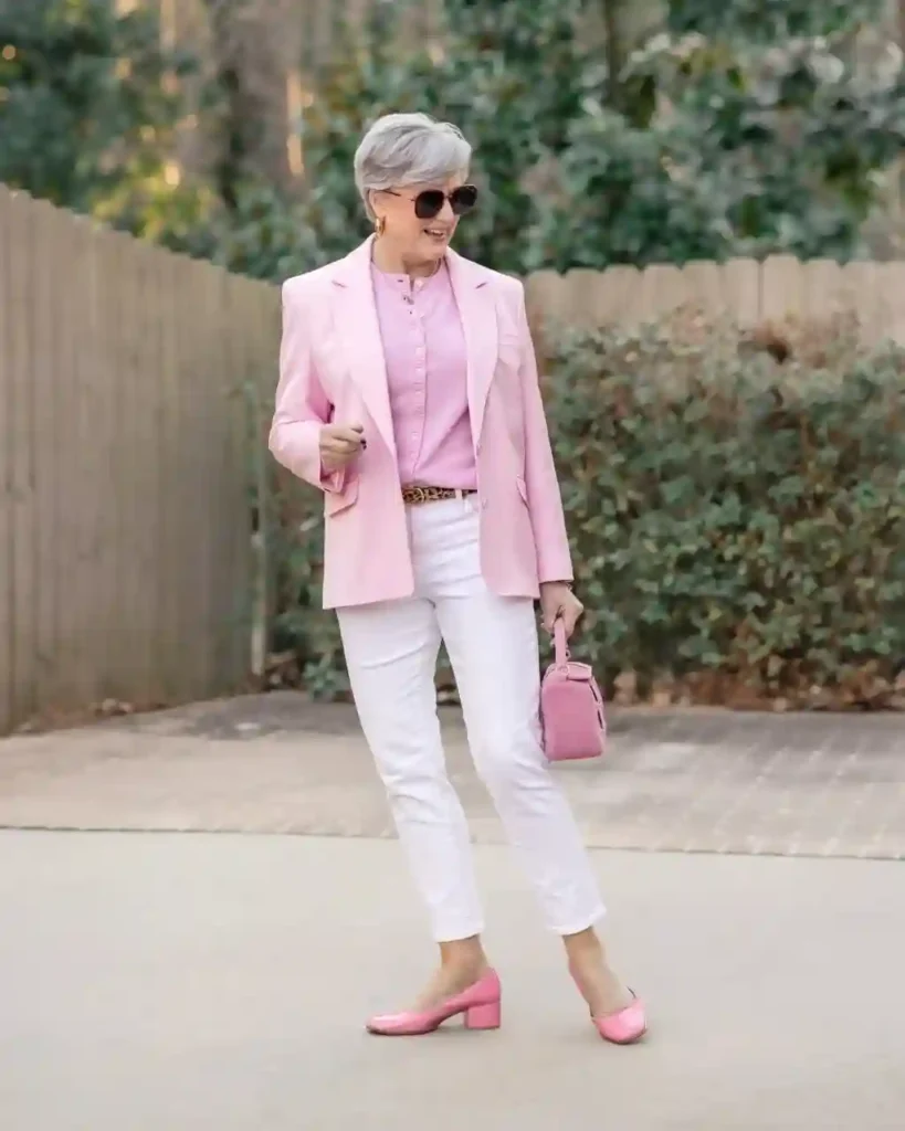 White denim provides a clean, neutral anchor for the pink tones, ensuring the outfit remains sophisticated rather than “sweet.” This is a fantastic choice for a garden tour, a spring festival, or a light-filled lunch at a vineyard.