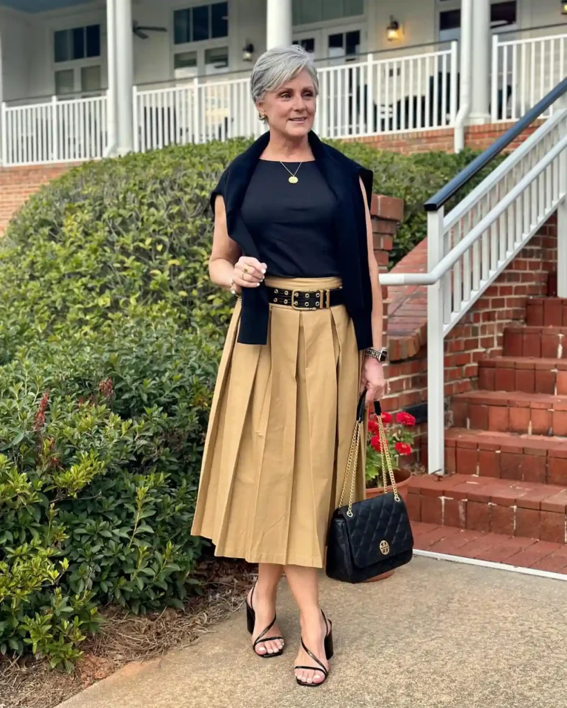 When traveling to warmer climates where you still want to look “put together,” a pleated midi skirt is your best friend. It offers much better airflow than trousers and creates a beautiful silhouette that moves gracefully as you walk.