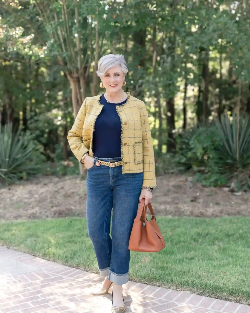 Contrasting the yellow with a dark navy knit and cuffed blue jeans creates a modern, “city-casual” look. The raw-fringe edges on the jacket add a touch of contemporary flair to a classic silhouette, making it feel fresh and fun.